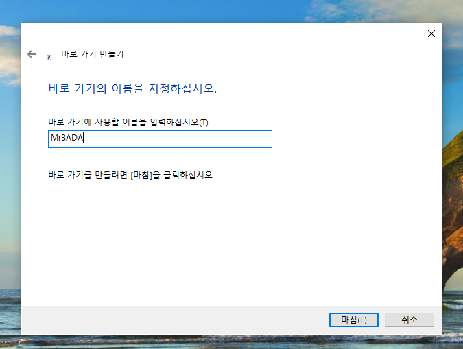 3. 바로 가기에 사용할 이름은 마음에 드는거 아무거나 넣고